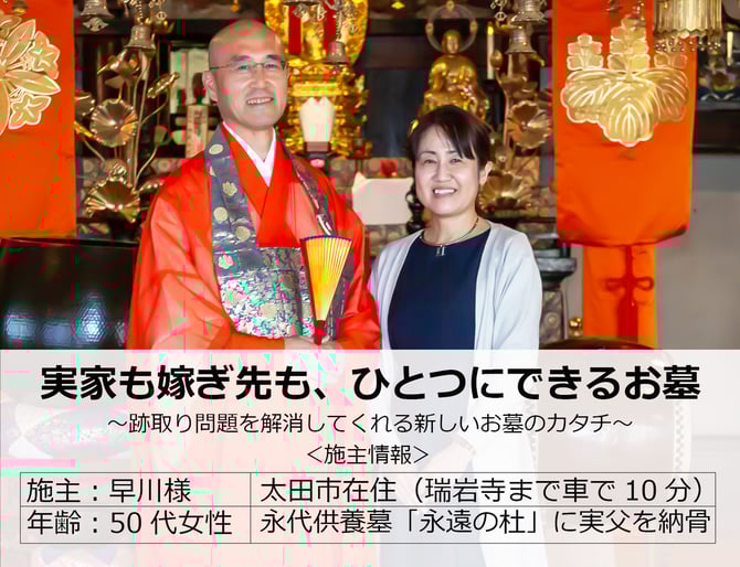 時代に合ったお墓があることを、長谷川住職に教えてもらいました。いま体を悪くしている母も瑞岩寺のお墓を気に入ってくれていますし、主人も弟も私の選択に納得してくれたので、このタイプのお墓が太田市にあって本当に良かったです。